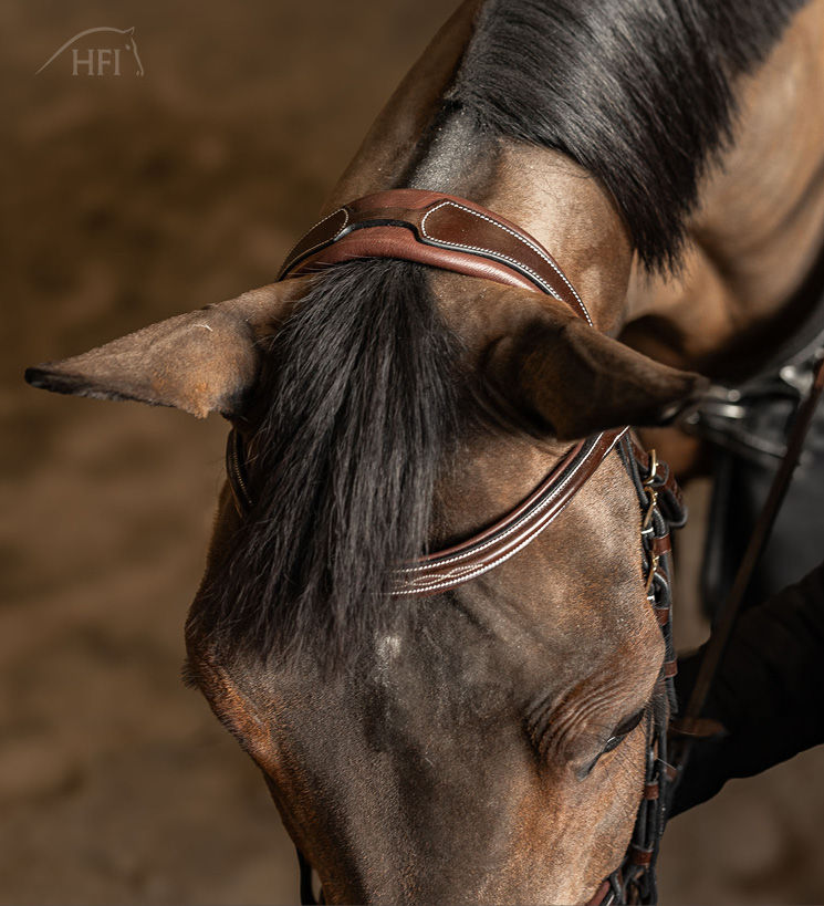 Frontal anatomique et muserolle ornés d’une broderie décorative, rembourrés et doublés de cuir souple