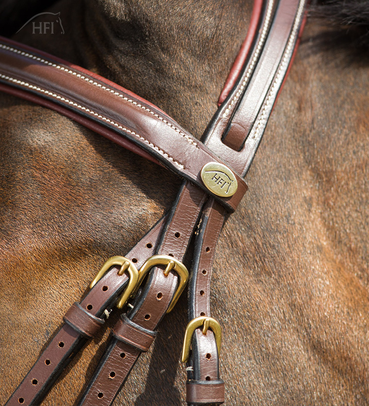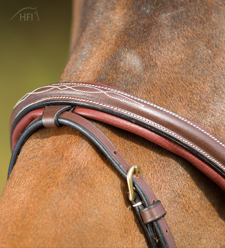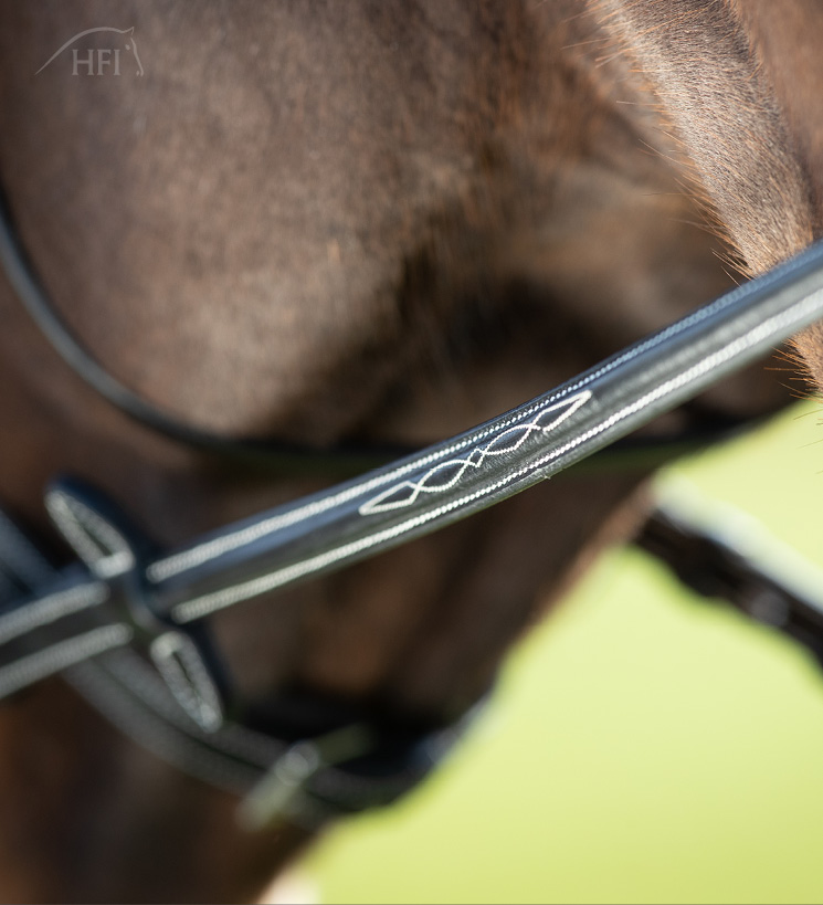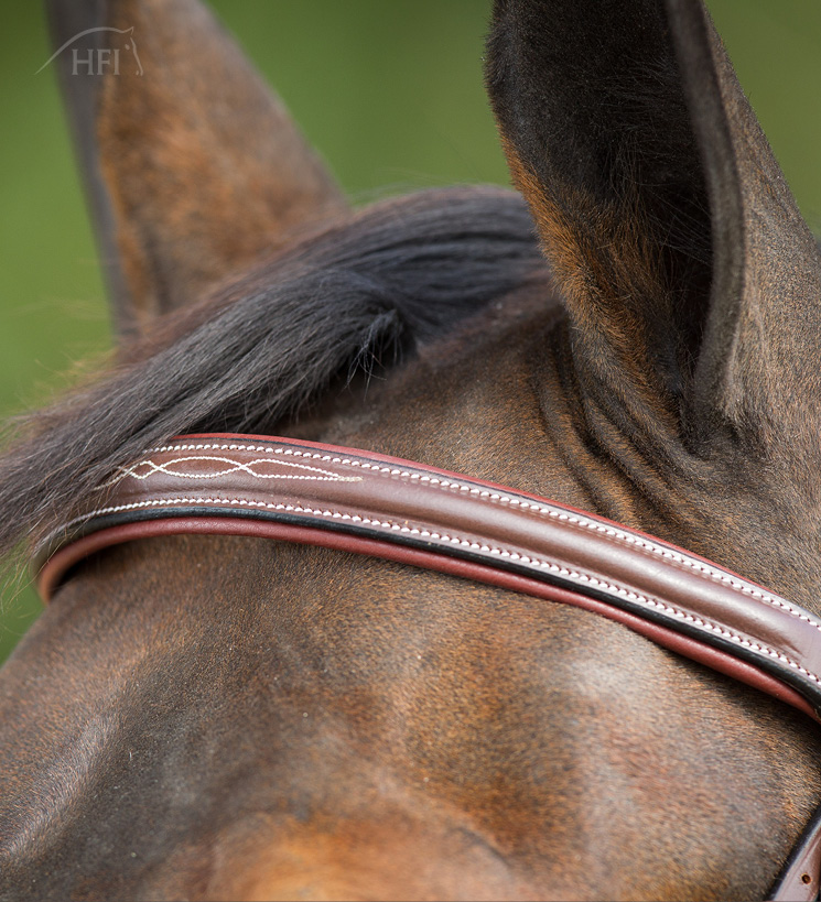 • Frontal et muserolle rembourrés, doublés de cuir souple et ornés d’une broderie décorative